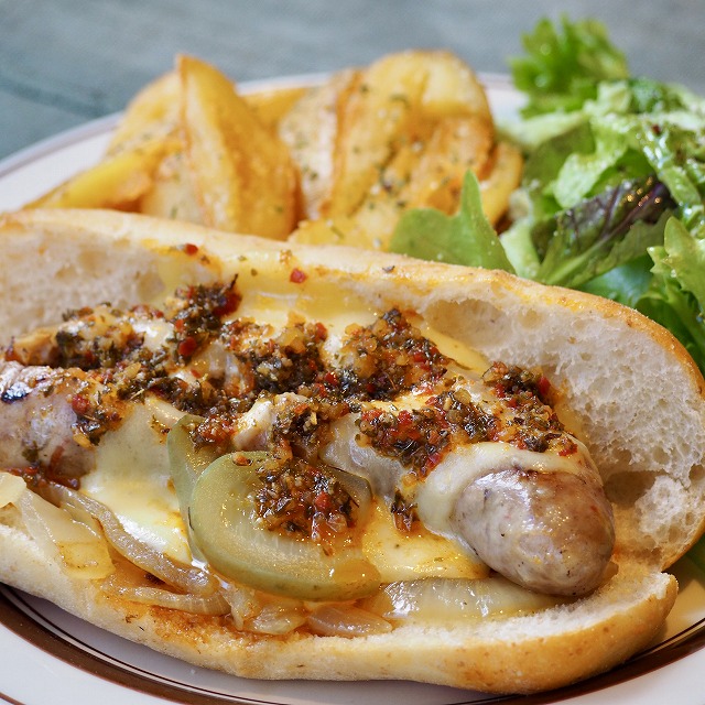 オススメ商品のこだわりポイント | 肉汁あふれるブラジル式ソーセージ「リングイッサ」を、香ばしいセミハードバケットでサンド!グリルドオニオンの甘みと、ナチュラルチーズをたっぷり使用し、9種のハーブを効かせた自家製チミチュリソースが旨味を引き立てる当店人気NO.1メニュー! |